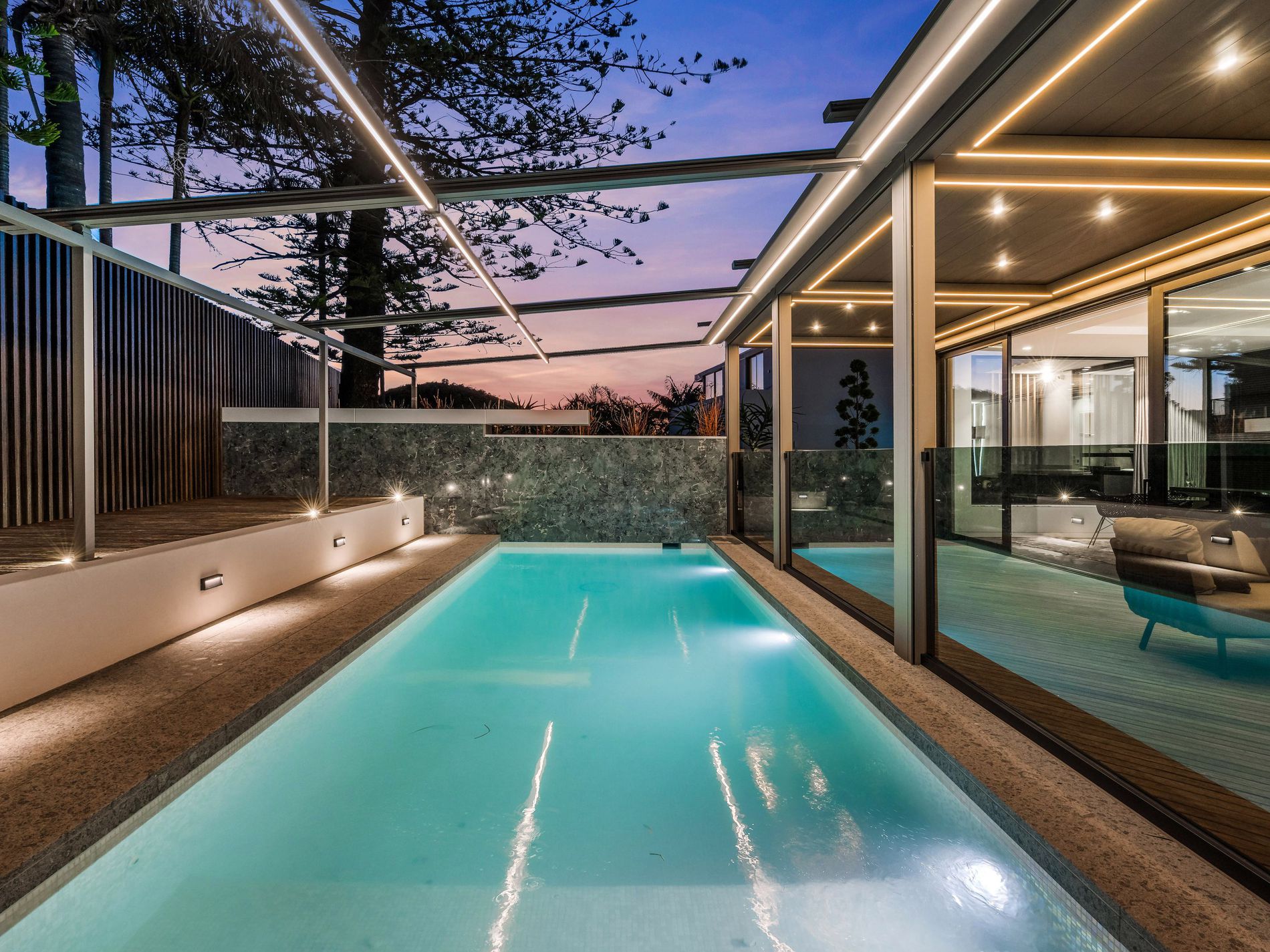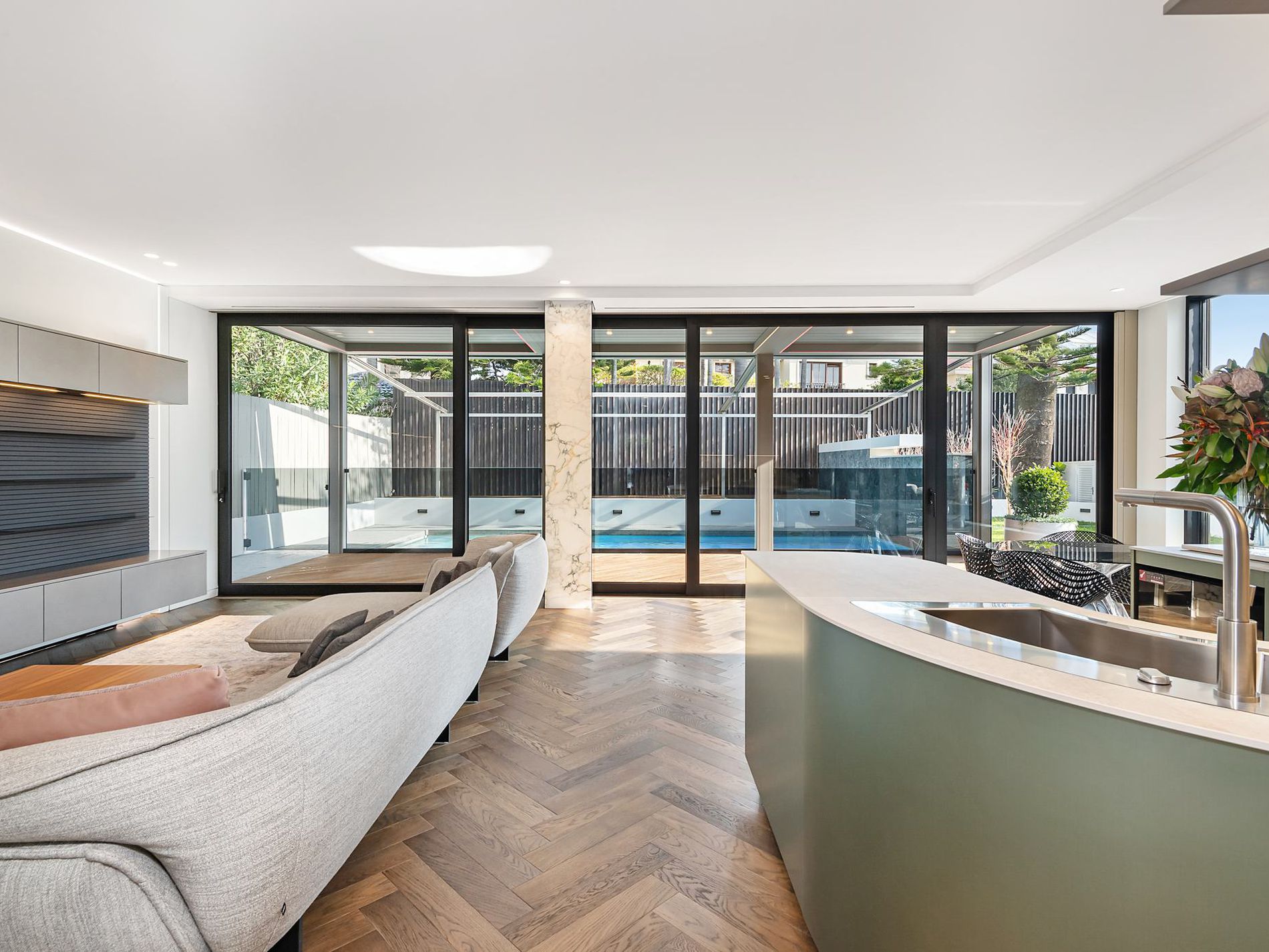 Crafted to perfection, the home showcases Calacatta Italian marble, custom Italian joinery, Swiss-made V-ZUG appliances, and C-Bus smart automation. The living spaces extend effortlessly to the heated pool, manicured lawn, and landscaped gardens.